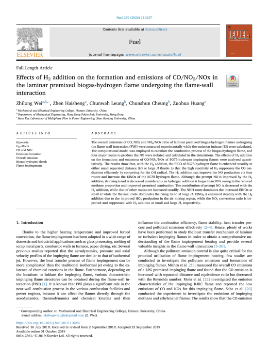 研究团队目前针对生物质气-氢气可再生能源的清洁高效利用,开展了广泛的基础应用研究,促进了对该可再生能源基础特性的认识和理解,为该可再生能源的清洁高效利用提供了多方面的理论支持。该研究得到了香港RGC项目(B-Q39F)和世界杯体育官方网站科研启动经费(KYQD(ZR)-1905)资助。