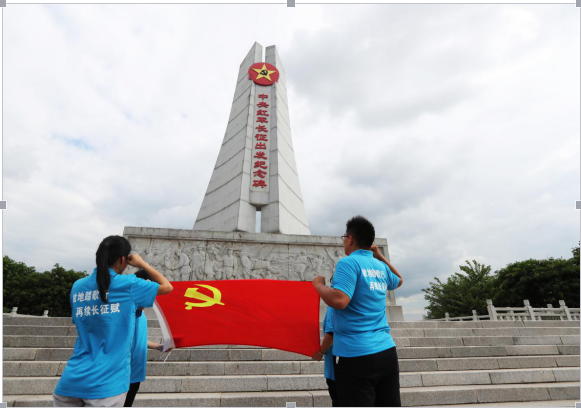 当天下午,李贺跟随采访团抵达了江西省赣州市于都县,参观了中央红军长征出发地纪念园。庄严的中共红军长征出发纪念碑矗立在纪念园的中央广场,大家远远地瞻仰着纪念碑,回想起当年先辈们在这块土地上的奋斗历史,不禁感到心潮澎湃,激动万分。在纪念碑下,在革命先辈的见证下,李贺同志和罗曼阿姨一同拉起党旗,高举右手,庄严宣誓。在纪念碑下,罗曼阿姨向李贺等年轻的党员讲述其父亲当年长征的故事,以鲜活的历史素材为他们上了一堂特殊的党课。