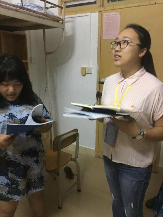 师兄师姐来到新生宿舍,对大一新生嘘寒问暖。按照学生会权益部的统一安排对宿舍存在的风扇不转、漏水、插座、空调故障等问题进行询问并登记。另外,党员和学生干部还对新生军训情况进行了了解,为他们讲解军训注意事项,并发放新生导航以供其参考。