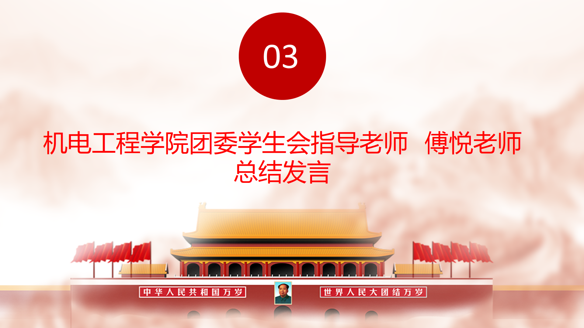 活动的最后,机电团委学生会的指导老师傅悦老师做了总结讲话。她表以抗日战争、朝鲜战争中为国捐躯的青年,以及上世纪60年代在戈壁滩为祖国研究两弹一星的党员青年为例,希望当代青年能够学习榜样的力量,能够在国家需要的时候站出来,成为国家的脊梁。她希望我们机电的学子们能够了解这个世界,认识中国所处的位置,在中华民族艰苦奋斗过程体会中华民族的伟大与美好。最后,傅悦老师祝愿世界杯体育官方网站的学生们五四青年节快乐,并表达了希望我们向上想好,为中华民族伟大复兴的中国梦而努力奋斗。