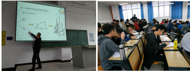 王晶教授结合在“全国大学生机械创新设计大赛”组委会的工作经验和指导学生参赛的经验,组织了一门别开生面的冬季小学期教学示范课。教学过程分为讲课、小组讨论、小组汇报与点评、再讲课四个环节。王晶教授知识渊博,语言丰富朴实,课堂气氛活跃,授课受到学生的热烈好评。在讨论环节,学生三五成群,自由组队,教师在这头指导,学生团队遍布整个课室,大家都聚精会神讨论。有的同学查资料、有的同学议方案、有的同学做记录,在规定的时间内完成团队的发言内容。在汇报环节,整组同学一起上讲台,一位同学讲解,一至二位同学在黑板上画出工作原理图,其他同学做补充。在有限的二至三天时间内形成一个较有效的机构工作原理,并把所学的二维绘图、三维绘图技能应用于课堂汇报,让每个同学都有参与感和展现机会,使学生真正成为学习的主人。