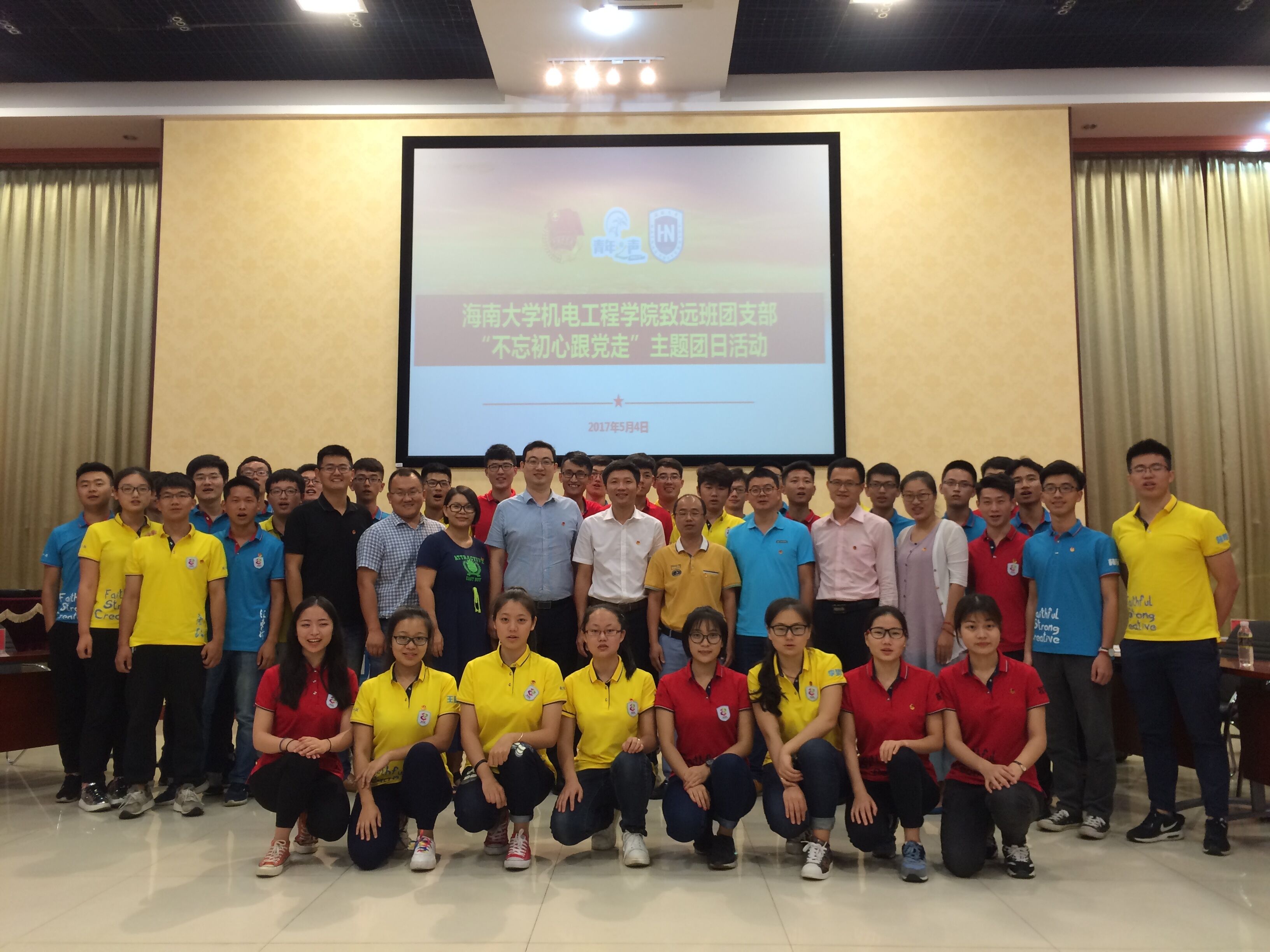 2017年5月4日下午,世界杯体育官方网站致远班团支部不忘初心跟党走---世界杯体育官方网站五四主题团日活动在思源学堂多功能厅举行。出席主题团日活动的有校团委副书记陈广锐,校团委综合科王远露、校团委组织科王寅,食品学院团委书记姚广龙、政管学院团委书记惠靖淼、艺术学院团委负责人武琼,世界杯体育官方网站党委副书记李宏,学工办主任崔建兵、团委负责人李青、16级辅导员印一凡。主题团日活动由致远班团支部张亚曦主持。