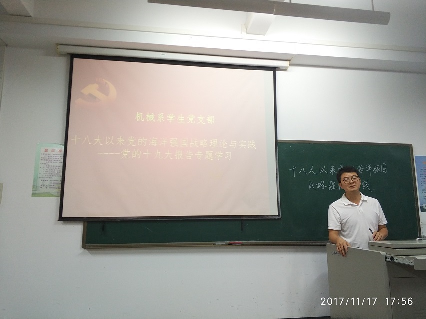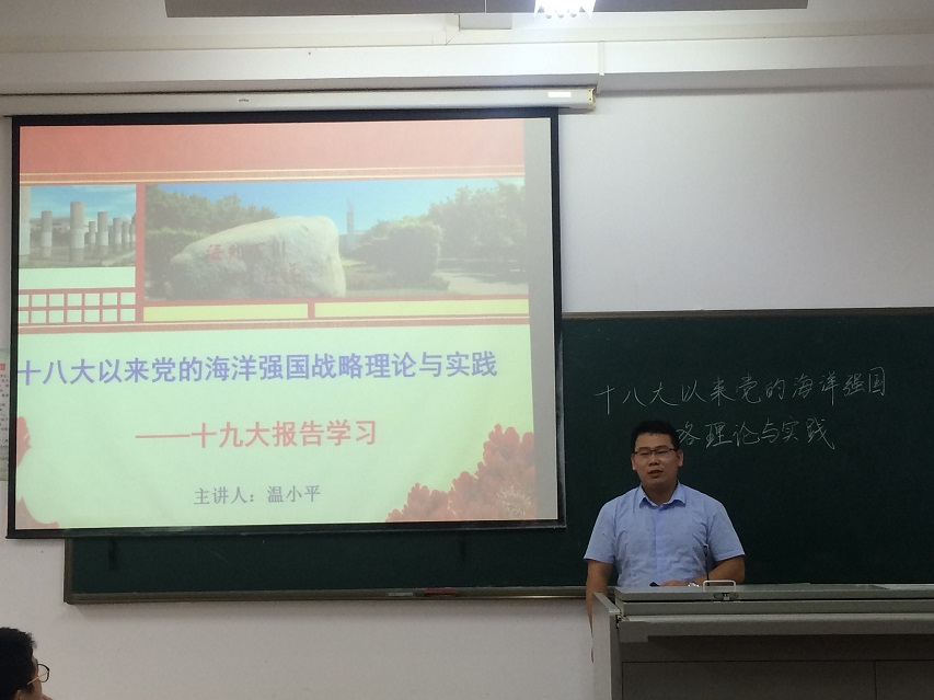 为了深入学习宣传贯彻党的十九大精神,增强新时代党员的理想意识、本领意识、担当意识,帮助党员同志进一步深刻理解党的十九大精神内涵,11月17日下午在4教206,机械系学生党支部邀请到马克思主义学院温小平老师作“党的十八大以来党的海洋强国理论与实践”为主题党的十九大专题报告会。机械系学生党支部书记崔建兵老师出席,全体党员、积极分子100多余参加专题学习。会议由支委赵琛主持。