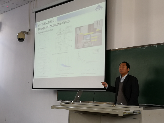 杨志永教授此次授课以“图像导向下的穿刺机器人的技术研究”为主题,并从介绍天津大学、医疗机械的背景与发展、手术机器人机构设计、手术机器人发展、合作与交流五大部分内容展开,围绕解决前列腺问题的核磁导向机器人、3D模板治疗肿瘤、立式近距离粒子植入设备一系列科研成果向学生介绍了医疗机械的广泛应用以及良好成效,在介绍个性化近距离粒子植入手术虚拟现实环境时,杨教授展示了虚拟室内模拟、心脏模拟等虚拟图像,强调了这一技术的发展将大大促进医疗技术的提升。