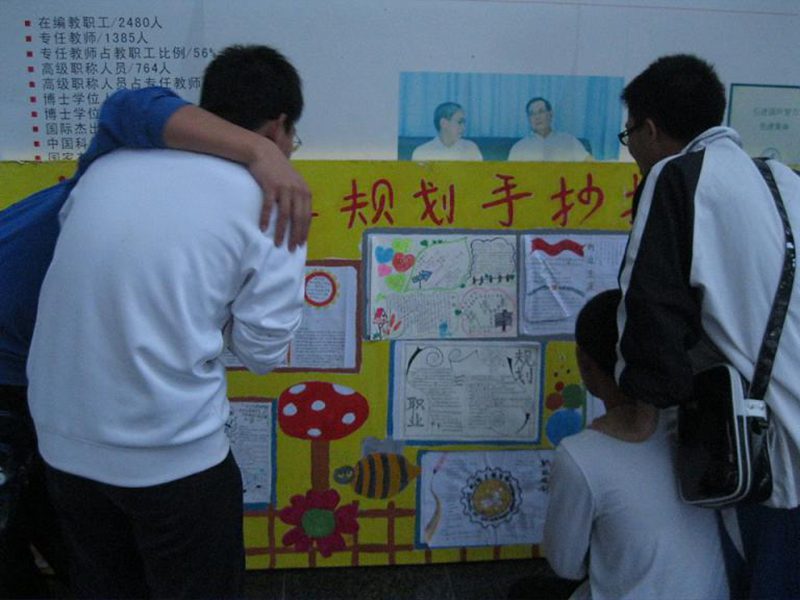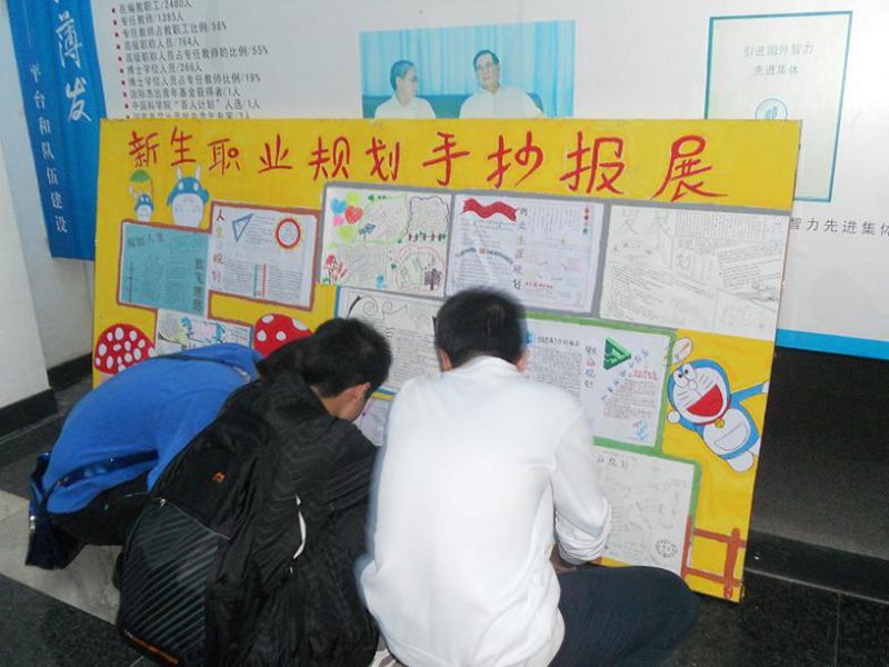 2011年11月20日,世界杯在3号教学楼前展出2011级新生“我画我规划”职业规划手抄报优秀作品,引来学子们饶有兴趣地驻足观看。