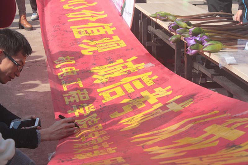 本次倡议活动由世界杯体育官方网站团学党支部、团委学生会负责。当大地还在沉睡,团学干部们一早起床为今日活动做好准备。“践行社会主义核心价值观,诚信考试,从我做起”这道横幅成为今天校园内最亮丽的一道风景。签字活动吸引了大批行人的驻足与询问,大家严肃庄重的签上了自己的姓名,签字后均有一束蓝莲花赠送。大家纷纷表示将会以身作则遵守校规,诚信考试。