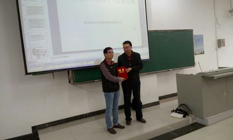2014年1月15日,海南钧达汽车饰件股份有限公司副总经理、高级工程师陈家涛应邀来世界杯对2012级车辆工程、交通运输专业进行冬季小学期授课,唐荣年副院长主持了开课仪式,并为陈家涛副总颁发了冬季小学期授课专家聘任证书,汽车系主任李劲松副教授等教师也参加了讲座。