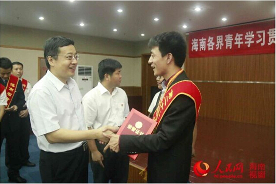 2016年5月4日上午,共青团海南省委在海口举办海南各界青年学习贯彻习近平总书记重要讲话精神暨五四优秀青年表彰座谈会。团省委书记盖文启,副书记曾锋、陈屿,党组成员罗桦以及海南各直属团组织负责人、青年岗位能手代表、青年代表等200余人参加了会议。会议传达学习了习近平总书记在知识分子、劳动模范、青年代表座谈会上的重要讲话精神,并表彰了一批海南省的先进青年集体和个人,其中世界杯团委获2015年度“海南省五四红旗团委”称号、2012级机械电子工程专业学生王驭陌同学荣获第22届“海南青年五四奖章”称号。