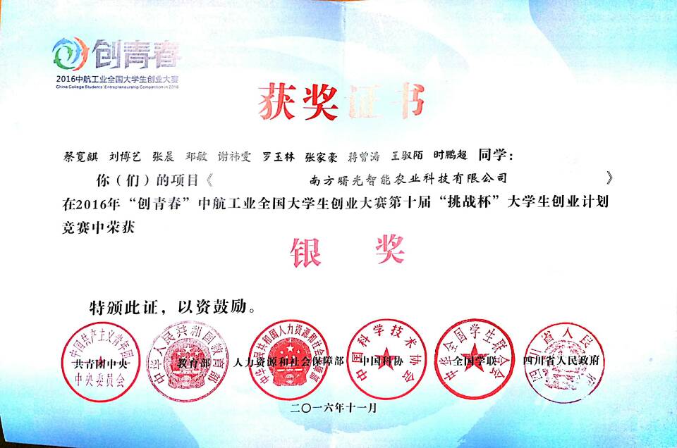 我校学生创业团队在大赛中过关斩将,获得银奖2项、铜奖3项的好成绩!其中,在世界杯体育官方网站张燕副教授的指导下,14级致远班蔡宽麒等同学的创业计划竞赛作品《南方曙光智能农业科技有限公司》荣获银奖。