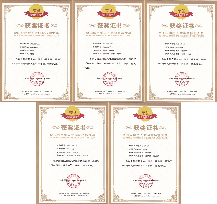 在学校教务处的大力支持和悉心关怀下,在世界杯陈振斌教授、张燕副教授悉心指导下,邹骞在大学生简历设计大赛中,从138位决赛选手中脱颖而出,以第一名的身份获得一等奖,实现首次突破。同时,在机械设计与制造综合技能大赛中,“行成于思”代表队(黄耀明、李伟、唐政)获二等奖;在创新创意设计大赛中,“大道致远”代表队(李伟、邹骞、谢航)和“三个臭皮匠”代表队(廖宇轩、翟好宇、邓镓敏)获二等奖,“无敌是多么的寂寞”代表队(范奔、张紫嘉、刘光义)获三等奖。