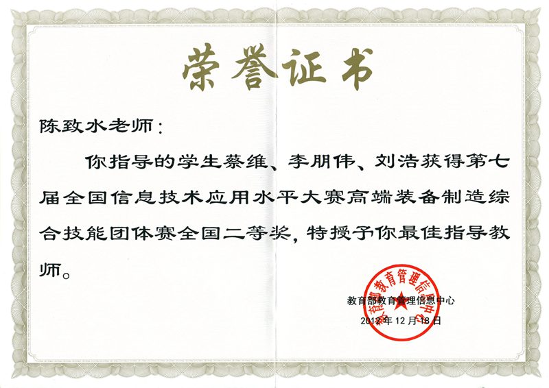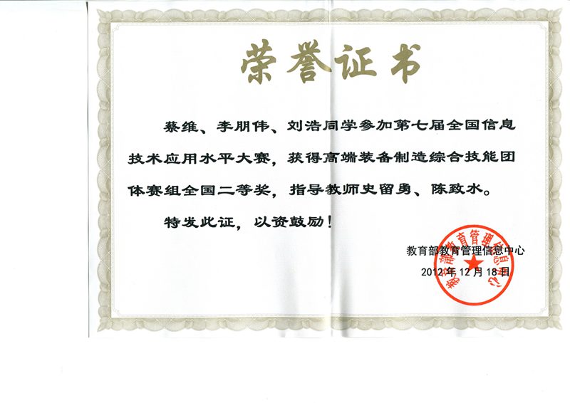 近日,我校世界杯体育官方网站师生参加第七届全国信息技术应用水平大赛(高端装备综合制造团体赛)并荣获全国二等奖。该项赛事于2012年5月启动,世界杯体育官方网站2010级机械设计制造及其自动化专业蔡维、李朋伟、刘浩等同学组成的团队在老师史留勇、陈致水的指导下,以“全自动椰果脱壳机械装置的设计”为题,在全国初赛1800多份作品中脱颖而出,成功进入了12月16日在北京科技大学举办的全国决赛。在决赛中,经过建模、答辩、作品展示等一系列环节,在强手如林的激烈竞争中最终斩获全国二等奖,史留勇、陈致水荣获“最佳指导教师”称号。颁奖典礼于12月18日在北京大学百年纪念讲堂举行。