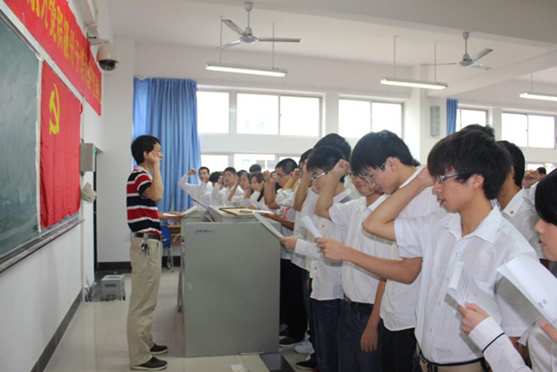 仪式在庄严的《国际歌》中拉开帷幕。连祥威、谢东原同学分别代表正式党员和入党积极分子发言。80多名预备党员在黄国标副书记领誓下面对鲜红的党旗庄严宣誓,表达了坚定跟党走,为共产主义事业奋斗终身的决心。