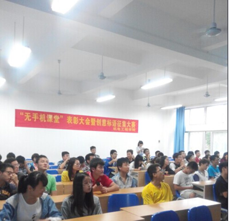 活动共分为四个环节:创意标语征集大赛、科技改变生活、手机进驿站活动的推广和无手机课堂先进班集体颁奖仪式。活动开始,主持人对到场的嘉宾及同学表示热烈的欢迎并详细地介绍了本次活动的流程。在创意标语征集大赛环节,为了保证比赛公平公正,其参评人员由今天到场所有同学共同担任,同学们都认真投入的阅读每一条标语并且给予打分。经过了激烈的评选后,优秀标语脱颖而出,最有文艺范的当属“拿起手机时想想自己高否?帅否?那么现在可以放下否?”在科技改变生活环节,主持人现场为大家播放了两个关于使用手机的视频,视频虽简短,却直截了当的突出手机带给我们的负面影响。在科技高速发展的今天,我们手中使用的手机越来越智能化,智能手机的出现,确实给我们的生活带来了便利,但是同时也给我们带来的一系列危害,它不仅影响休息,贻误学业,最严重的是手机辐射能够严重影响我们的身体健康。在主持人的肺腑之言下,很多学生充分认识到了手机带给我们的危害,纷纷表示将参与手机驿站活动。紧接着辅导员崔建兵老师意味深长的讲话把活动推向了高潮,他希望同学们在以后能够坚持参加此项活动,树立一个好的榜样,顿时场上响起了一阵阵热烈的掌声。最后,伴随着音乐的响起,最令人激动的环节来临,所有人都期待着优秀班集体到底花落谁家,最终机电一班和自动化获得了优秀班集体称号,由崔建兵老师为获得优秀班集体称号的班级颁发奖状。颁奖仪式结束后,同学们进行了横幅签名活动,预示着手机驿站活动又一批新鲜血液的加入。最后伴随着愉悦的氛围,活动渐渐落下了帷幕。