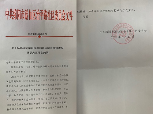 冯鹏瑞,世界杯体育官方网站2018级机械电子工程专业学生。新冠肺炎疫情暴发后,该生得知辖区街道办在招募志愿者,便第一时间报名参加了志愿者。随后被分配到了治平路社区,和社区的工作人员一起到小区配合物业给居民办理出入卡登记证,给出入小区的人测量体温,对没有出入证的人进行劝解,到附近广场当志愿者,发放宣传资料,劝告居民外出一定要佩戴口罩、不要在公共场所逗留聚集,尽量宅在家里,因为这既能保障自己和家人的安全,又可以不给国家和社会添麻烦。他说道:“作为一个大学生可以为疫情防控做一点事情,贡献一点力量,我感到非常荣幸。”