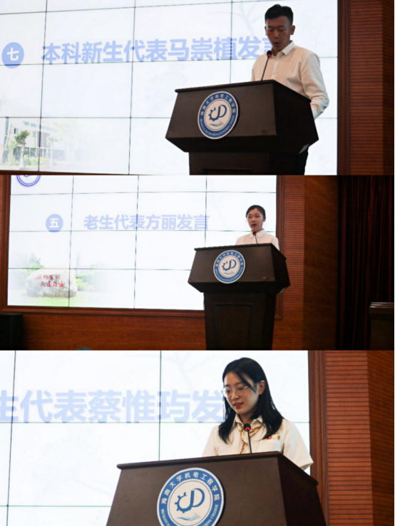 老生代表方丽分享了自己在大学学习过程中的经历和经验,鼓励21级新生在新的起点中把握好分分秒秒,祝愿新生学业有成,前程似锦。21级本科新生代表马崇植、研究生代表蔡惟玙也分别表达了对即将开始的学习生活的期待和勇于进取的决心。