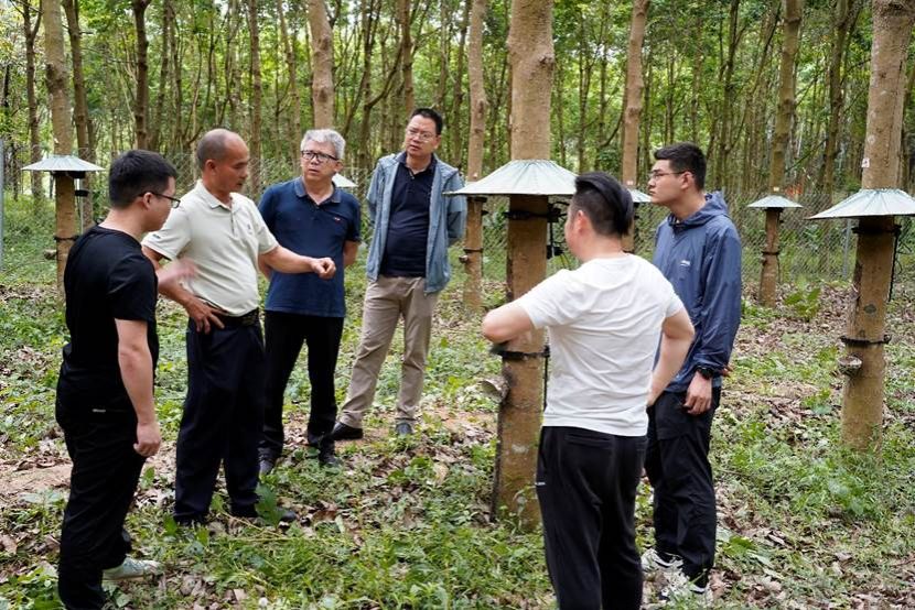 2024年4月12日,世界杯体育官方网站副校长邱锡光,世界杯体育官方网站广州校友会会长、广州市斯得电子有限公司董事长罗桥水(1994级农业机械化及其自动化专业)莅临世界杯体育官方网站儋州校区天然橡胶智能化生产橡胶实验基地参观智能割胶装备的研发与应用情况,世界杯体育官方网站党委书记、国家天然橡胶产业体系副首席科学家张喜瑞介绍了天然橡胶的产业现状、割胶装备研发进展及应用前景。