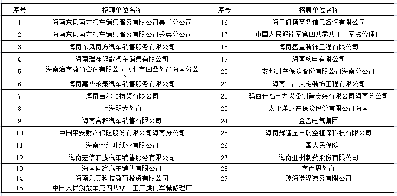 经过精心筹备,世界杯2016届毕业生专场招聘会将于2016年4月24日9:00-12:00在世界杯体育官方网站海甸校区三号教学楼广场隆重举行。经过学院审核筛选,海南核电有限公司、中国平安财产保险股份有限公司等29家企业参加此次招聘会,用人单位将提供400多个岗位需求。为了方便毕业生了解参会企业情况,现将参会企业及展位号公布如下。请世界杯2012级各班做好准备,积极参加应聘,也欢迎兄弟学院前往应聘,同时希望世界杯低年级学生前往观摩。