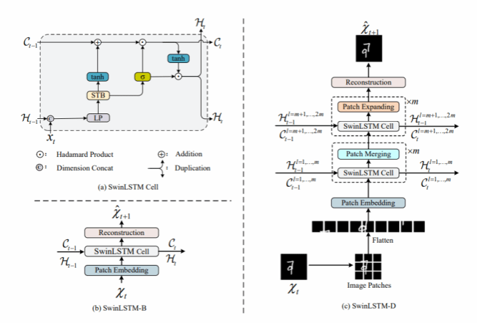 1、 提出了一种新的循环单元SwinLSTM,它能够有效地提取时空表征。与以往基于卷积神经网络的方法不同,完全采用自注意力机制建模全局空间信息,减少了局部建模带来的信息损失。