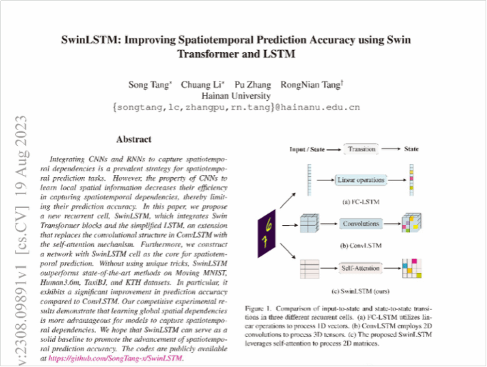 近日,我院智能信息处理研究团队2021级硕士研究生唐松同学在唐荣年教授和李创教授的联合指导下,在国际顶级会议IEEE/CVF International Conference on Computer Vision(简称ICCV)上发表最新研究论文(如图1所示),题目为“SwinLSTM: Improving Spatiotemporal Prediction Accuracy using Swin Transformer and LSTM”。ICCV 是全球计算机领域顶级的学术会议,每两年召开一次,享有极高的学术声誉,本届会议共有 8068 篇投稿,接收率为26.8%。